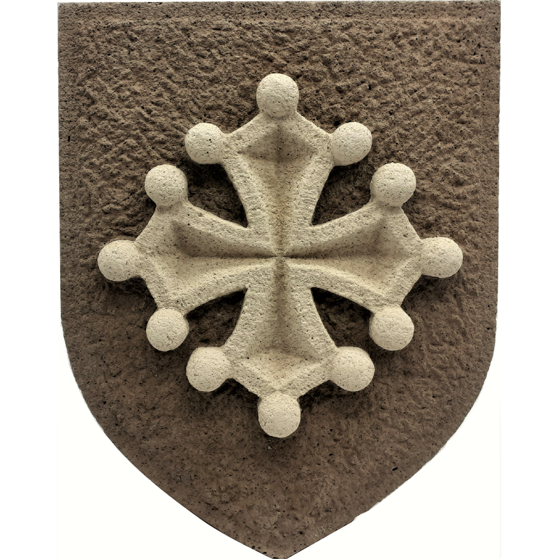 Blason croix en Occitane en pierre de 4 cm d'épaisseur, d'après modèle original sculpté sur pierre, puis re-moulée à la main en 2 couleurs, avec des pigments naturels, teinté dans la masse.