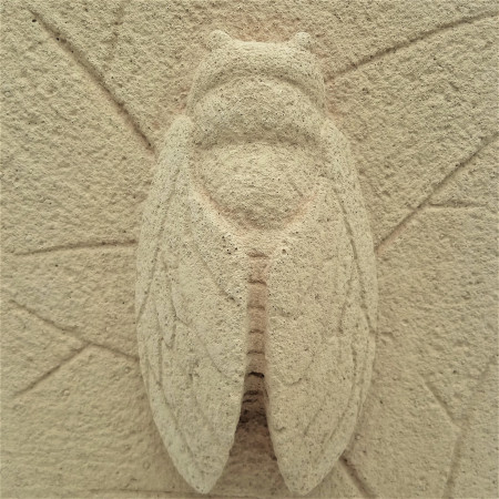 Cigale en pierre reconstituée massive de 5 cm d'épaisseur, cigale en pierre moulée, d'après modèle original de cigale sculptée en pierre taillée, cigale sur fond ciselé. Cigale en Pierre.?